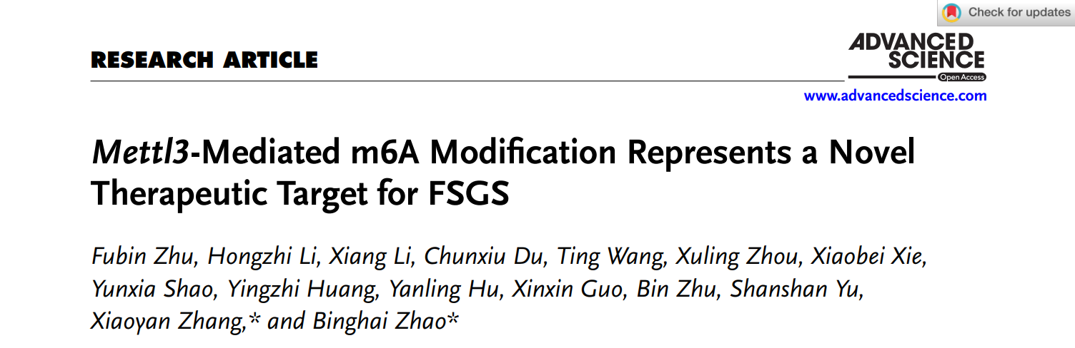 近日,华东师范大学医学与健康研究院张晓燕教授、北华大学基础医学院赵冰海教授团队,联合在 Advanced Science (中科院双一区,IF:14.1)上发表了题为 “Mettl3-Mediated m6A Modification Represents a Novel Therapeutic Target for FSGS ”的研究论文。该研究首次揭示了RNA m6A甲基化修饰酶METTL3在FSGS发生、发展中的关键保护作用及分子机制,并首次证实通过外源性补充m6A模拟物可有效缓解FSGS疾病进展。