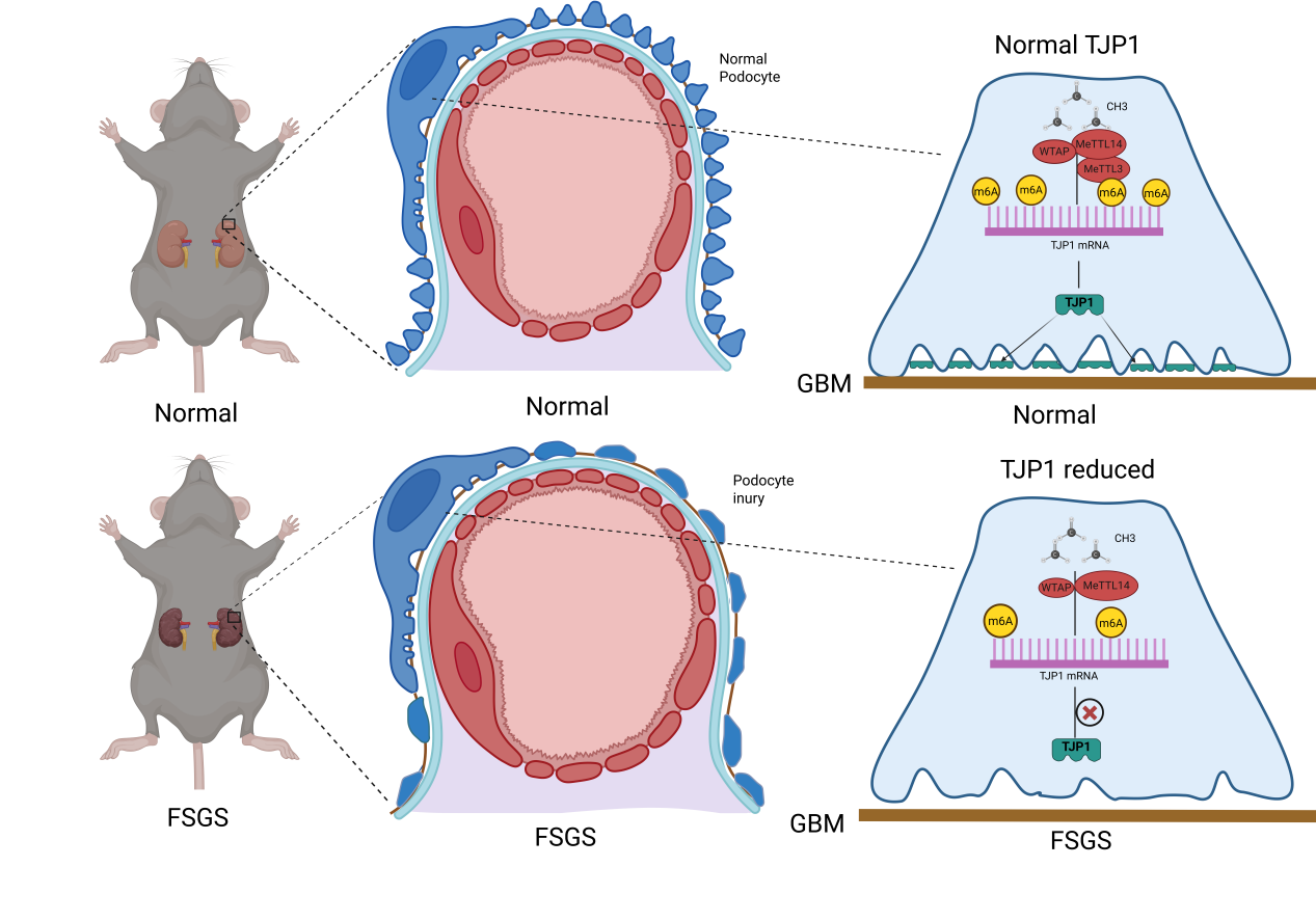 局灶性节段性肾小球硬化(FSGS)是临床常见的肾小球病变,也是导致终末期肾病的主要原因之一。据统计,FSGS占儿童肾病综合征病例的约20%,成人病例的40%。其发病与多种遗传因素有关,目前临床上仍缺乏特效疗法。在过去几十年间,医学界对于表观遗传因素,尤其是RNA修饰在FSGS中的作用认知甚少,也缺乏基于表观遗传机制的干预策略。